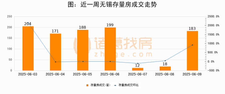 从存量房来看,2025年06月09日无锡存量房单日成交183套,比昨日增加165套,环比上涨916.7%。从近一周存量房成交来看,无锡存量房日均成交套数为139套,06月09日单日成交183套,高于近一周平均水平31.7%。
