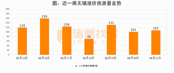 根据诸葛找房数据显示,无锡24小时涨价房源量为107套,较06月20日增加6套,环比上涨5.9%。与此同时,涨价房源占比小幅扩大,业主信心有所提升。