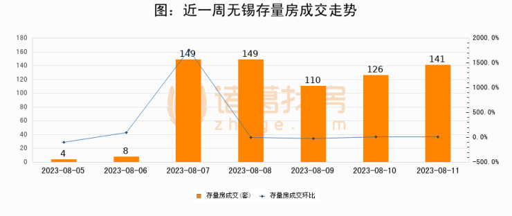 从存量房来看,2023年08月11日无锡存量房单日成交141套,比昨日增加15套,环比上涨11.9%。从近一周存量房成交来看,无锡存量房日均成交套数为98套,08月11日单日成交141套,高于近一周平均水平43.9%。