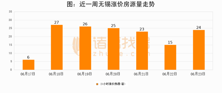 根据诸葛找房数据显示,无锡24小时涨价房源量为24套,较06月22日增加9套,环比上涨60%。与此同时,涨价房源占比小幅扩大,业主信心有所提升。