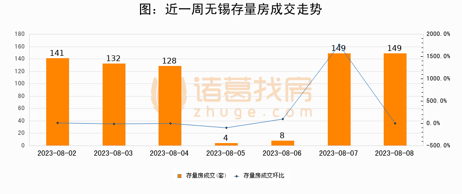 从存量房来看,2023年08月08日无锡存量房单日成交149套,比昨日持平。。从近一周存量房成交来看,无锡存量房日均成交套数为101套,08月08日单日成交149套,高于近一周平均水平47.5%。
