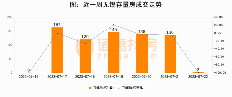 从存量房来看,2023年07月22日无锡存量房单日成交2套,比昨日减少134套,环比下降98.5%。从近一周存量房成交来看,无锡存量房日均成交套数为100套,07月22日单日成交2套,低于近一周平均水平98%。