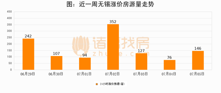 根据诸葛找房数据显示,无锡24小时涨价房源量为146套,较07月04日增加70套,环比上涨92.1%。与此同时,涨价房源占比小幅扩大,业主信心有所提升。