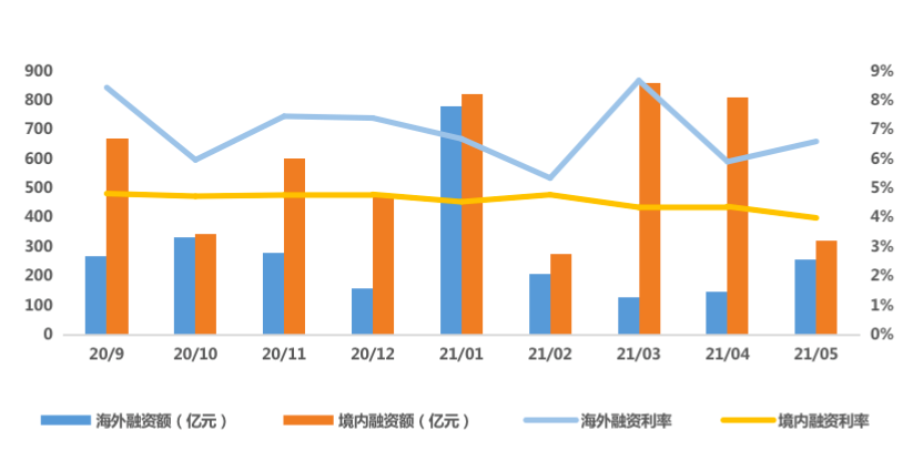 主要是由于境内融资收紧,5月出台多项资产证券化产品的规范性政策限制房企融资,境内债权融资有所影响,融资量下降;受此影响,房企将关注点转向海外,并且随着近期人民币走强等因素下,境外债权融资得到较大的恢复,5月出现同环比大增的势头。