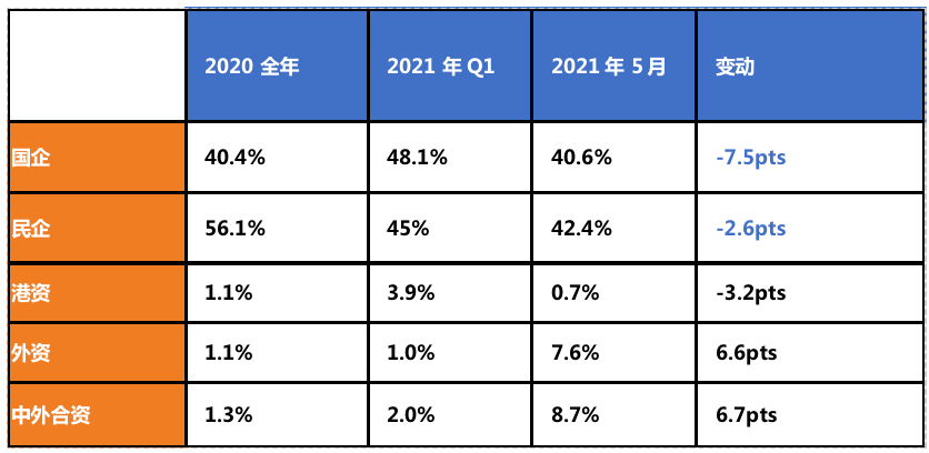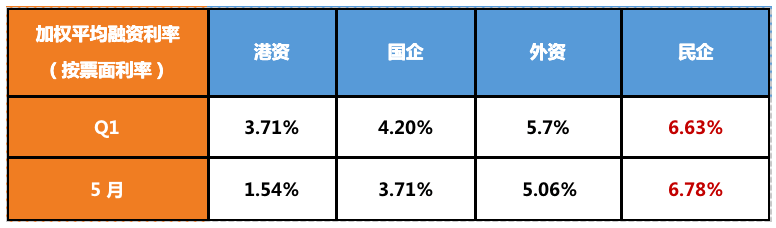 表:2021年Q1及5月各类房企平均融资利率(按票面利率)