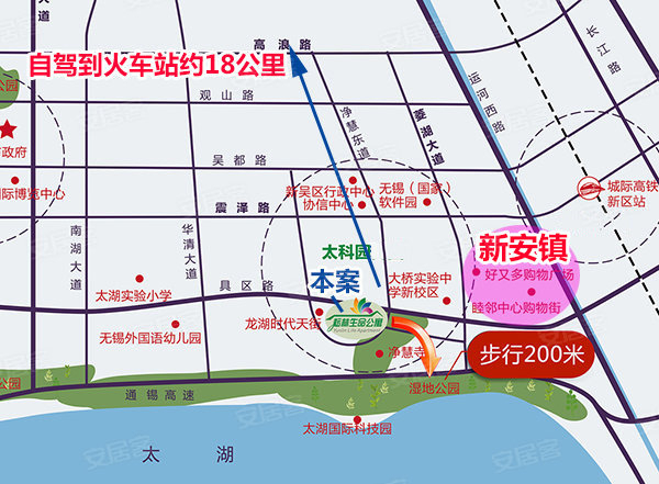耘林生命公寓选址无锡太湖科技产业园,项目位于具区路与净慧东道交叉口,往南步行约300米即到沿太湖湿地公园,西临规划中的太湖新城政务中心,东接无锡新区,紧邻沪宁高速公路和312国道。