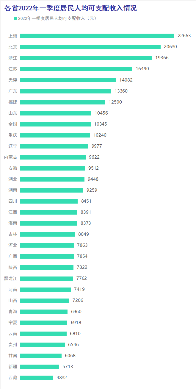 从居民人均可支配收入来看,一季度,全国居民人均可支配收入10345元,比上年名义增长6.3%,扣除价格因素,实际增长5.1%。对比10345元的“国家线”,上海、北京、浙江、江苏、天津、广东、福建、山东这8个省份的居民人均可支配收入跑赢了全国水平。