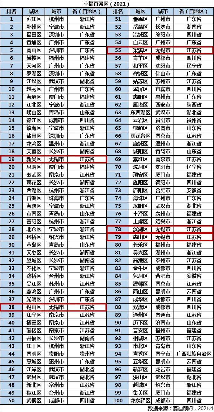 据了解,这一榜单从就业收入、消费供给、科教文卫、智慧治理、和谐共享、生态绿色六个一级指标共计19个二级指标,构建了幸福城区的评价体系,以2020年数据为核心研究,对全国898个市辖区的幸福程度进行了综合评估,形成了《幸福百强区(2021)》。