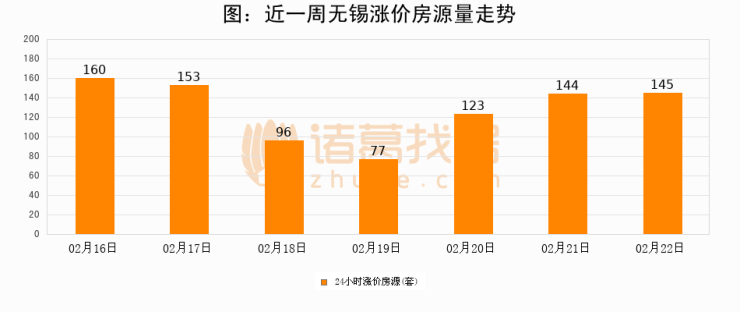 根据诸葛找房数据显示,无锡24小时涨价房源量为145套,较02月21日增加1套,环比上涨0.7%。与此同时,涨价房源占比小幅扩大,业主信心有所提升。