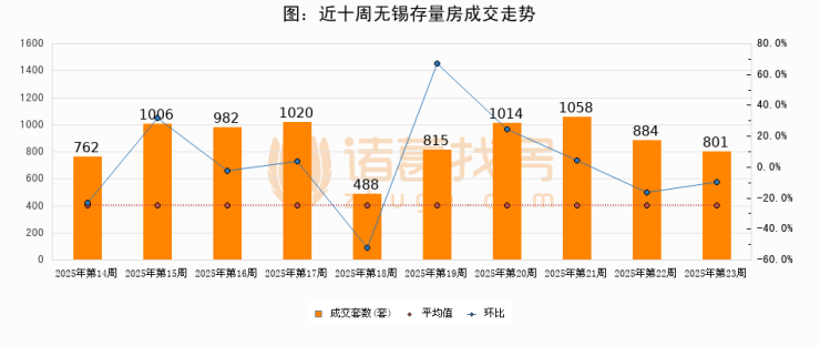 存量房方面,第23周无锡存量房成交801套,较上周减少83套,环比下降9.4%。从近十周成交走势来看,周均成交套数为883套,本周低于平均水平9.3%。