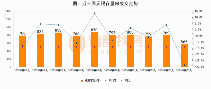 存量房方面,第01周无锡存量房成交565套,较上周减少224套,环比下降28.4%。从近十周成交走势来看,周均成交套数为781套,本周低于平均水平27.7%。