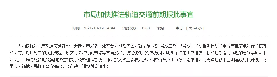 早在今年10月19日,无锡市自然资源和规划局发出《市局加快推进轨道交通前期报批事宜》一则消息。