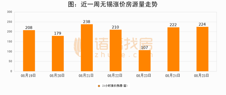 根据诸葛找房数据显示,无锡24小时涨价房源量为224套,较08月24日增加2套,环比上涨0.9%。与此同时,涨价房源占比小幅扩大,业主信心有所提升。