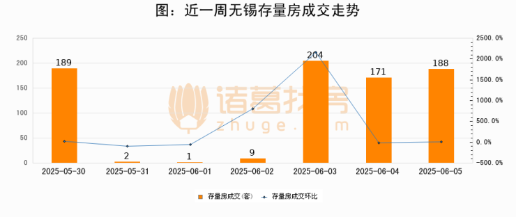 从存量房来看,2025年06月05日无锡存量房单日成交188套,比昨日增加17套,环比上涨9.9%。从近一周存量房成交来看,无锡存量房日均成交套数为109套,06月05日单日成交188套,高于近一周平均水平72.5%。