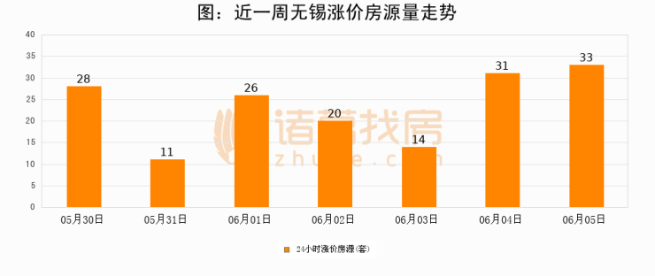 根据诸葛找房数据显示,无锡24小时涨价房源量为33套,较06月04日增加2套,环比上涨6.5%。与此同时,涨价房源占比小幅扩大,业主信心有所提升。