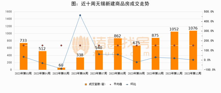进入2023年第12周(03月13日-03月19日),无锡新建商品房成交1076套,较上周增加24套,环比上涨2.3%