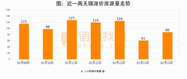 根据诸葛找房数据显示,无锡24小时涨价房源量为88套,较01月14日增加27套,环比上涨44.3%。与此同时,涨价房源占比小幅扩大,业主信心有所提升。