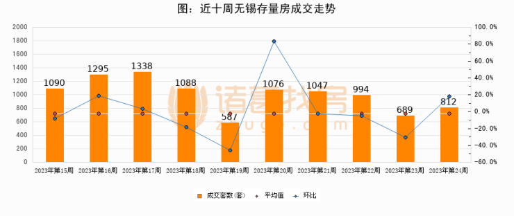 存量房方面,第24周无锡存量房成交812套,较上周增加123套,环比上涨17.8%。从近十周成交走势来看,周均成交套数为1001套,本周低于平均水平18.9%。