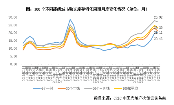 销量下滑之下,楼市库存迅速积压,去化周期拉长。机构监测显示,截至今年5月,100个城市平均去化周期为23.3个月,其中,一二线城市去化周期为21个月,三四线城市为27个月。