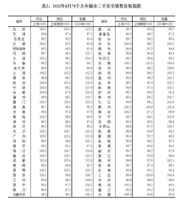 2022年6月70个大中城市二手住宅销售价格指数。 截图自国家统计局官网