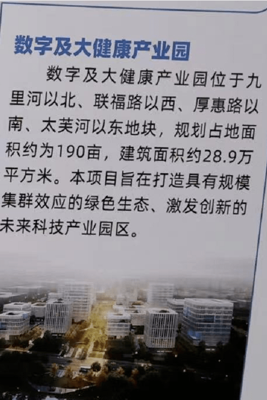 数字及大健康产业园位于九里河以北、联福路以西、厚惠路以南、太芙河以东地块,规划占地面积约为190亩,建筑面积约28.9万㎡。