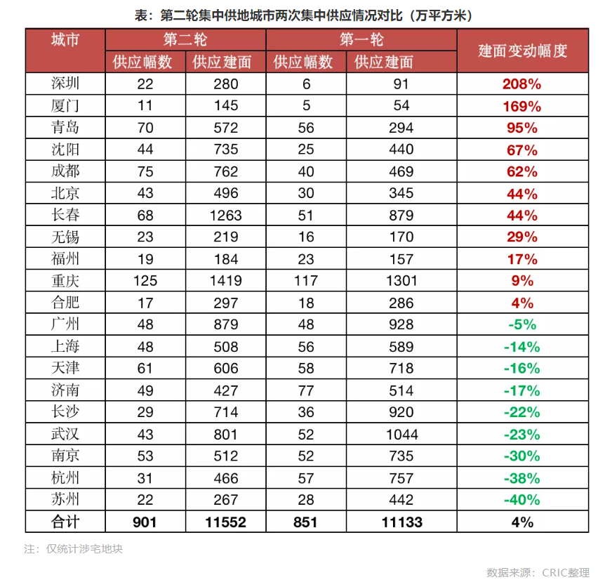此外,各城市间分化较为显著。其中,苏州、杭州、南京、武汉、长沙等城市第二轮供地规模较首轮明显下滑,降幅均超20%;其他城市较首轮均有明显上涨,尤其是深圳、厦门、青岛等地,供应规模均实现翻番。