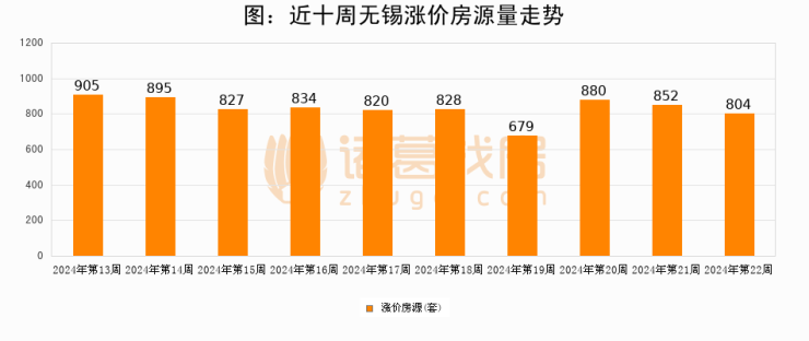从调价房源来看,第22周无锡涨价房源804套,较上周下降5.6%。与此同时,22周涨价房源占比回落1.62个百分点,业主信心小幅波动,购房者可则需入市。