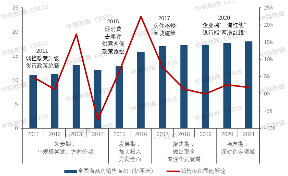 房地产企业明确提出多元化业务转型始于约十年以前,涉足多元化经营则要更早。房地产企业多元发展的一个显著特征是“政策周期性”,政策与监管的严与宽、引导与抑制,直接影响了房企多元发展的力度与方向。房地产市场调控政策在促进房地产市场平稳健康发展的同时,也间接影响到房地产企业在多元业务上的投入,伴随严格的监管政策而来的,往往是房企加大多元发展力度。同时,棚改与城市更新等改善居民生活质量的政策为房企发展提供了新方向。通过梳理房地产企业近十年来多元化转型的发展历程,中指研究院将其大概划分为四个阶段:起步期(2011年至2014年) ,发展期(2015年至2016年),聚焦期(2017年至2019年)及稳定期(2020年至今)。