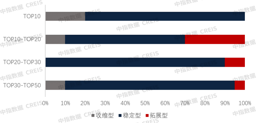 根据近两年房企公布的发展战略、多元业务经营计划及现状,中指研究院将50家典型房企分为三类:收缩型,稳定型与拓展型。其中,收缩型房企更多地聚焦主业,未提及新的多元化发展方向,放弃部分已有的多元业务;稳定型房企发展战略与往年保持基本一致,多元业务方向基本相同,在既有赛道持续投入与发展;拓展型房企提出新的多元发展战略,独立出多元业务部门,或者尝试新的多元发展方向、布局新的业务领域。