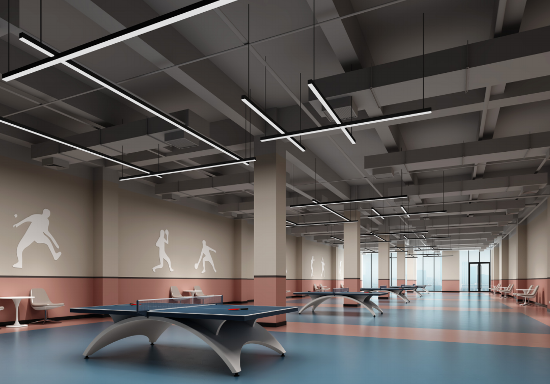 体育中心建筑风格简洁明快,体现出体育“刚劲有力”的特点,墙面、天花板等植入各类运动元素。