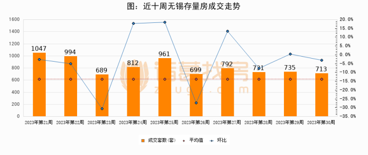 存量房方面,第30周无锡存量房成交713套,较上周减少22套,环比下降3%。从近十周成交走势来看,周均成交套数为817套,本周低于平均水平12.7%。