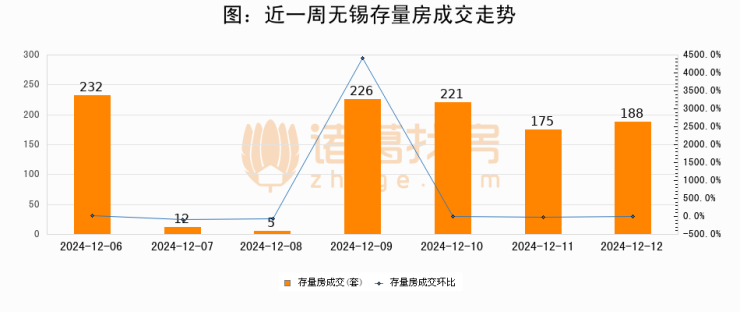从存量房来看,2024年12月12日无锡存量房单日成交188套,比昨日增加13套,环比上涨7.4%。从近一周存量房成交来看,无锡存量房日均成交套数为151套,12月12日单日成交188套,高于近一周平均水平24.5%。