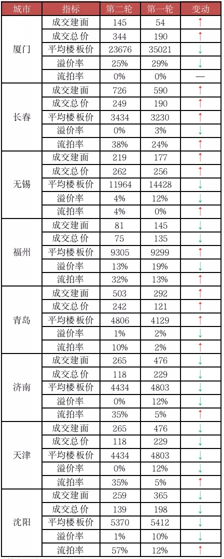 对比首轮集中土拍热度来看,所有城市二轮集中土拍热度均有所下滑:成交溢价率均较首轮有所降低,尤其是济南、天津等低热城市,溢价率降幅均在十个百分点以上;除厦门外,其余七市二轮流拍率均大幅走高,沈阳、长春、福州、济南和天津等城市二轮土地出让流拍率均超过了30%。