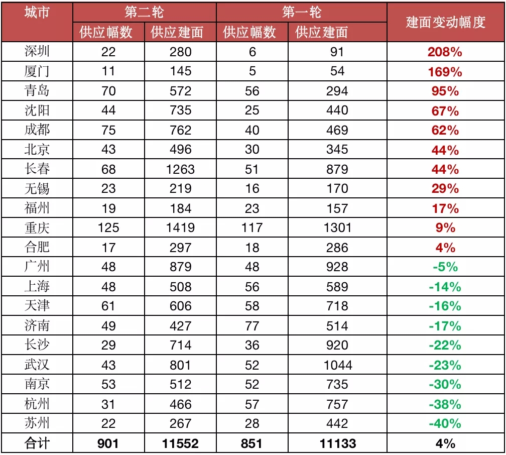 具体各城市间分化较为显著。其中,苏州、杭州、南京、武汉、长沙等城市第二轮供地规模较首轮明显下滑,降幅均超20%;其他城市较首轮均有明显上涨,尤其是深圳、厦门、青岛等地,供应规模均实现翻番。