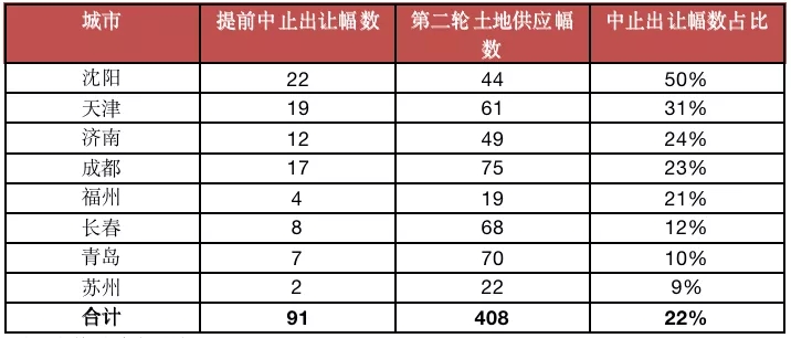 截止9月17日,已经相继有长春、福州、天津、青岛、济南、成都、苏州、沈阳等8个城市在第二轮集中土拍前临时中止出让,总数量高达91宗,占这些城市第二轮集中供地总幅数的22%。其中沈阳中止出让宅地最多,高达22宗,占其第二轮集中供应总量的比重高达50%。