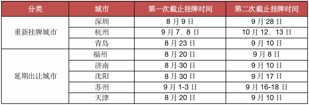 值得注意的是,由于土拍规则调整,第二次集中供地过程中,多城土地延期出让或重新挂牌,譬如深圳、杭州、青岛均停止挂牌之后重新挂牌,福州、济南、沈阳、苏州和天津等城市均延期出让。就出让时间来看,很多本该8月集中土拍的城市被挤压至9月、10月。