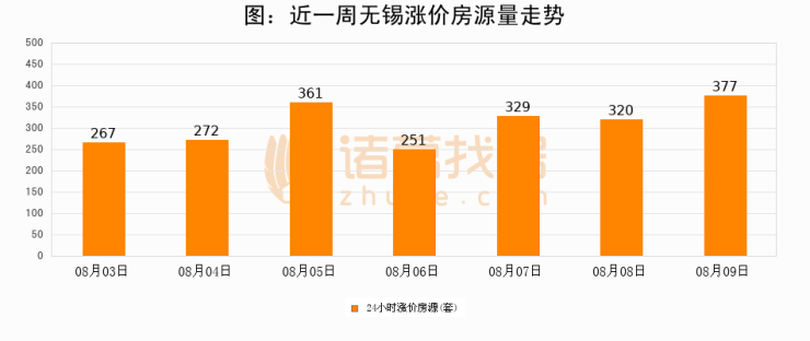 根据诸葛找房数据显示,无锡24小时涨价房源量为377套,较08月08日增加57套,环比上涨17.8%。与此同时,涨价房源占比小幅扩大,业主信心有所提升。