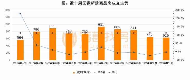 进入2022年第51周(12月12日-12月18日),无锡新建商品房成交626套,较上周减少16套,环比下降2.5%