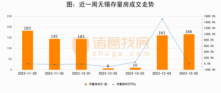 从存量房来看,2023年12月05日无锡存量房单日成交166套,比昨日增加5套,环比上涨3.1%。从近一周存量房成交来看,无锡存量房日均成交套数为116套,12月05日单日成交166套,高于近一周平均水平43.1%。