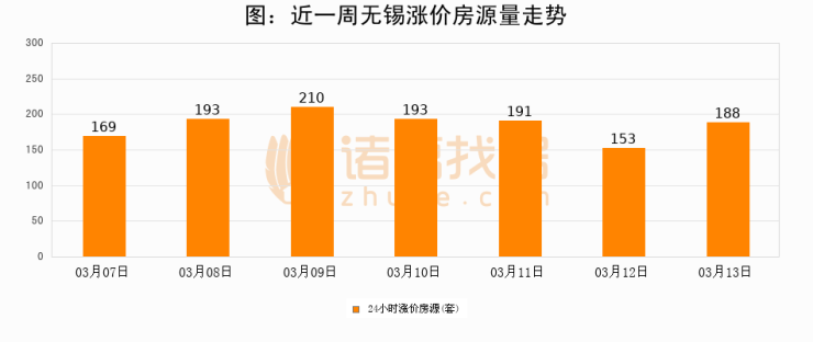 根据诸葛找房数据显示,无锡24小时涨价房源量为188套,较03月12日增加35套,环比上涨22.9%。与此同时,涨价房源占比小幅扩大,业主信心有所提升。