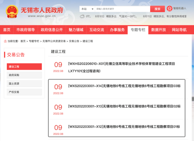 刚刚,无锡市人民政府官网发布了无锡地铁6号线工程无锡地铁6号线工程勘察项目01标-03标,其中有两个重要时间点:2023年7月30日,提交工程勘察成果;2023年7月至2028年1月,配合施工。