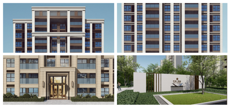 建筑造型构图和谐,分段明确,线条疏朗,形象统一。采用了经典的三段式建筑构图——顶部古铜色金属花式现代精细,标识性强;中部浅米色涂料优雅挺拔,富有韵律;底部石材门头设计尊贵厚重,细节精致。