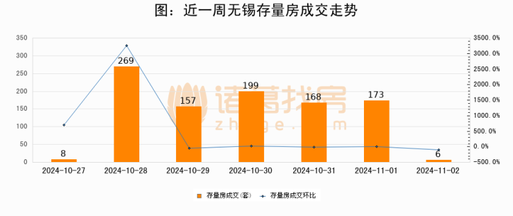 从存量房来看,2024年11月02日无锡存量房单日成交6套,比昨日减少167套,环比下降96.5%。从近一周存量房成交来看,无锡存量房日均成交套数为140套,11月02日单日成交6套,低于近一周平均水平95.7%。