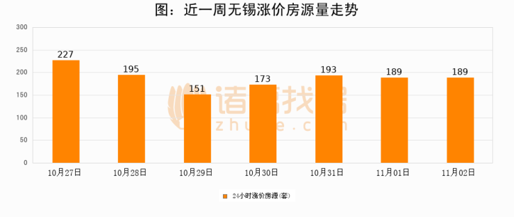 根据诸葛找房数据显示,无锡24小时涨价房源量为189套,较11月01日持平。