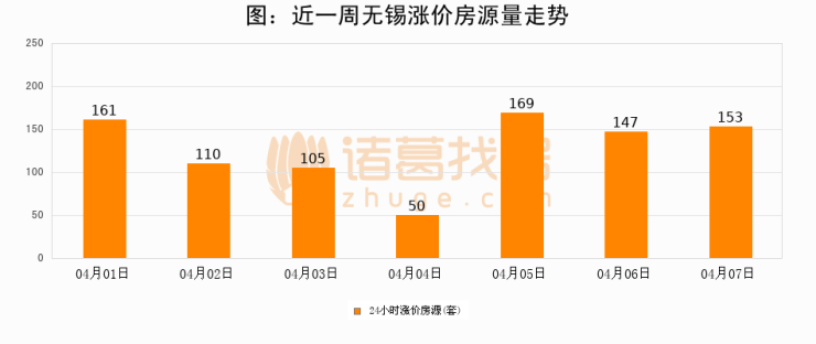 根据诸葛找房数据显示,无锡24小时涨价房源量为153套,较04月06日增加6套,环比上涨4.1%。与此同时,涨价房源占比小幅扩大,业主信心有所提升。