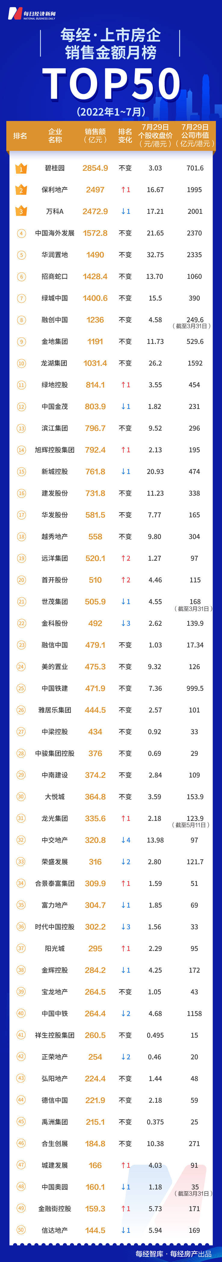 “抢收季”正式拉开序幕,上市房企TOP50却有点“卷不动了”。7月榜单中,26家排名保持不变,7组房企互换了排名,升幅较大的仅爬升2名。