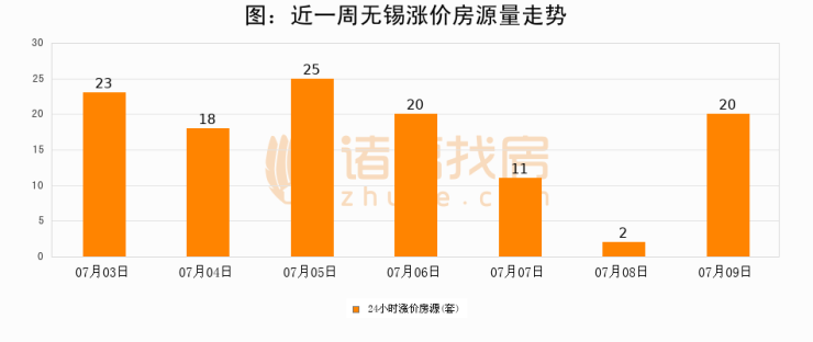 根据诸葛找房数据显示,无锡24小时涨价房源量为20套,较07月08日增加18套,环比上涨900%。与此同时,涨价房源占比小幅扩大,业主信心有所提升。