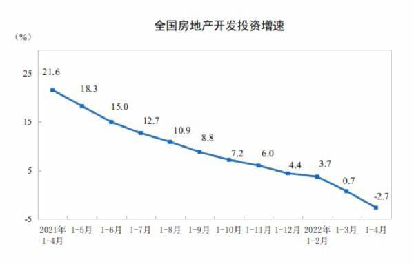 5月16日,国家统计局发布2022年1—4月份全国房地产开发投资和销售情况。数据显示,今年前4个月,全国房地产开发投资增速同比由正转负,这也是自2020年6月以来首次出现负增长。
