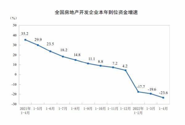 从房地产开发企业到位资金情况看,1—4月份,房地产开发企业到位资金48522亿元,同比下降23.6%,到位资金增速维持负增长且继续走低。
