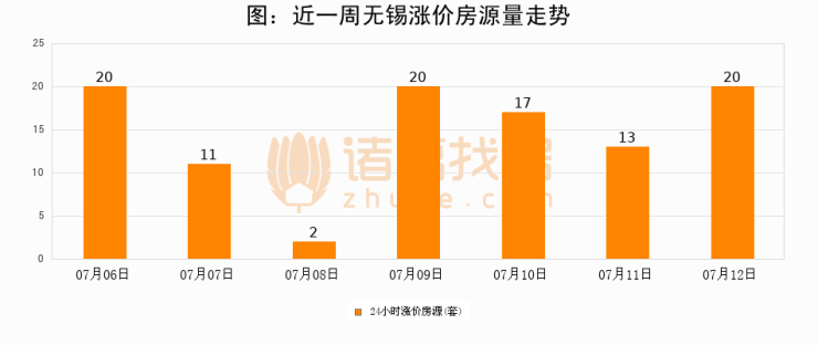 根据诸葛找房数据显示,无锡24小时涨价房源量为20套,较07月11日增加7套,环比上涨53.8%。与此同时,涨价房源占比小幅扩大,业主信心有所提升。